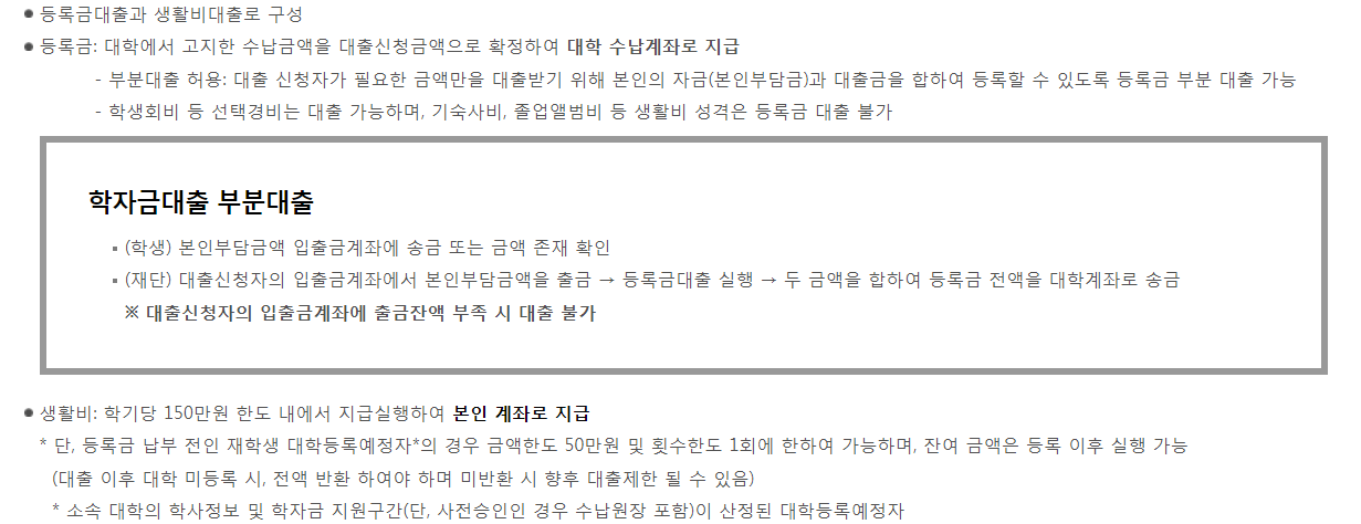 학자금 대출은 등록금 대출과 생활비 대출로 나뉩니다. 등록금 대출은 대학에서 수납고지한 수납금액을 대출금액으로 하고, 더불어 부분대출도 가능합니다. 다만, 기숙사비 또는 졸업앨범비 등과 같은 생활비 종류는 등록금 대출에 포함되지 않습니다.