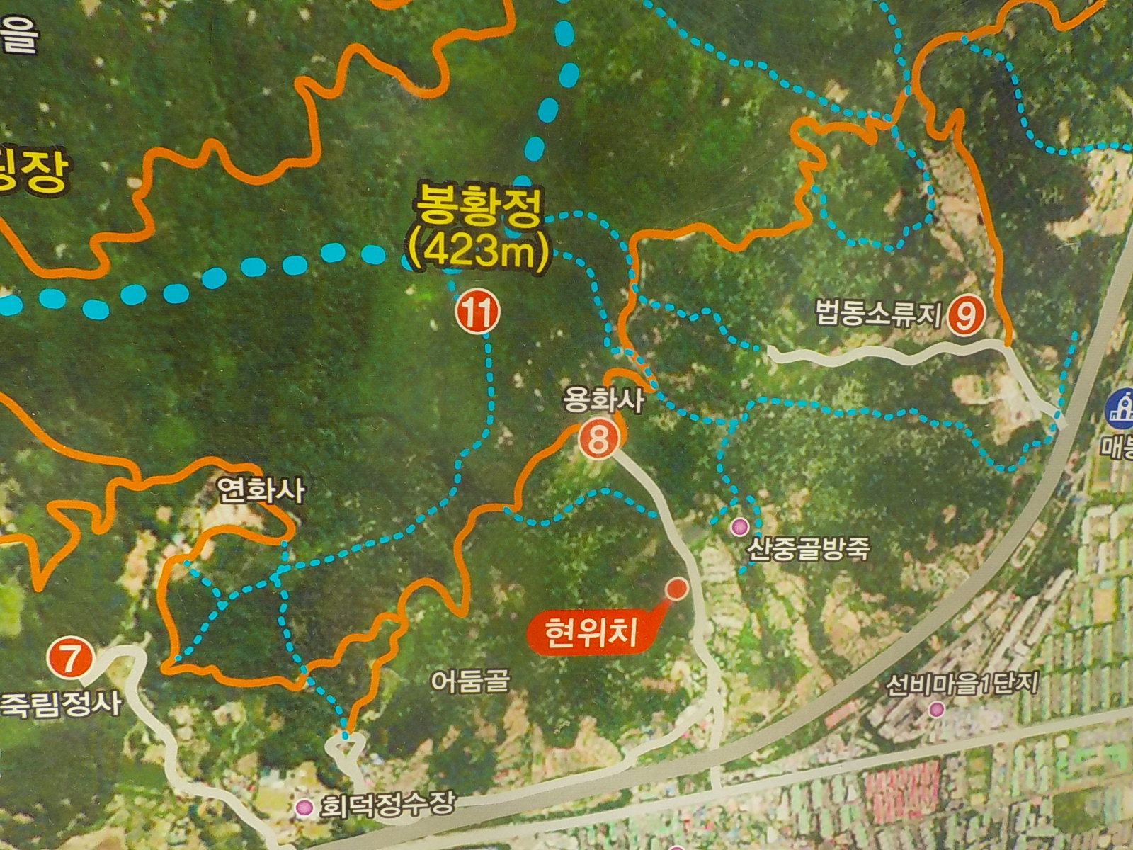 근처에 있는 등산지도부터 확인을 했습니다. 이곳 계족산 무료주차장에서 봉황정까지의 구간으로, 별다른 갈림길이나 길을 잘못들만 한 요소들은 없습니다. 조성되어 있는 등산로를 따라 쭈욱 올라가면 끝...