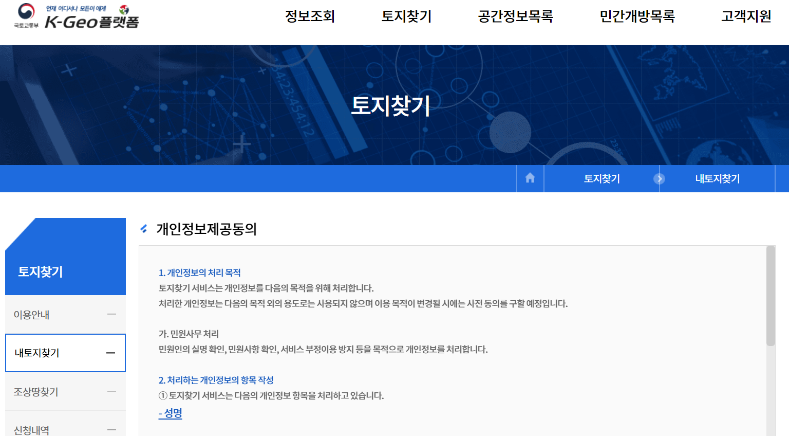사이트 오른쪽 중간쯤을 보면 '내 토지 찾기' '조상땅 찾기' 같은 항목이 보이실겁니다. 이름 그대로 내 명의로 된 토지를 찾고 싶거나, 혹은 있을지도 모를 내 조상의 땅을 찾을 수 있는 메뉴입니다. 조상땅 찾기도 호기심이 가지만, 오늘은 내 토지 찾기를 소개해드리는 글이니 내 토지 찾기부터 들어가봅니다. 조상땅 찾기가 궁금하신 분들은 그것도 도전(?) 해보셔도 되겠습니다.내 토지 찾기로 들어가면 다음과 같이 개인정보제공동의 화면으로 넘어갑니다.