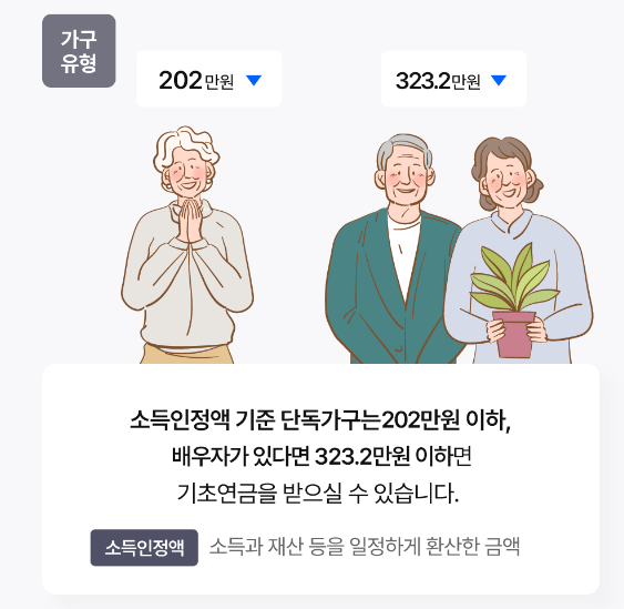 노령연금이라 불리는 기초연금 대상자는 만 65세 이상의 대한민국 국적을 가진 사람으로서, 대한민국 국내에 거주 중이어야 하며 가구의 소득인정액이 단독가구인 경우에는 202만 원, 부부가구인 경우에는 223만 2천 원 이하여야만 합니다. 여기서, 공무원연금, 군인연금, 사립학교교직원연금, 별정우체국연금 수급권자 및 그 배우자는 원칙적으로 수급대상에서 제외됩니다.