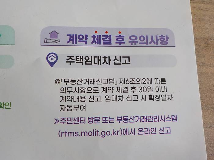 계약 체결 후 30일 이내 계약 내용을 신고해야만 하며, 임대차 신고 시 확정일자가 자동으로 부여됩니다. 아마 이사 자주 해보신 분들은 잘 아실만한 내용일 겁니다. 전입신고하러 동사무소에 곧바로 가야 한다는 의미...