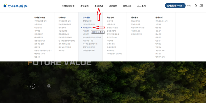 사이트 맨 위쪽에 보면 아래 사진과 같이 '주택담보대출' '주택보증' '주택연금' 등과 같은 메뉴들이 보일 겁니다. 그중 '주택연금' - '예상 연금 조회' 항목으로 들어가면, 오늘 소개해드리는 주택 연금 수령액 계산식이 나옵니다. 빨간색 화살표로 표기를 했으니, 찾기 어렵진 않으실 겁니다.