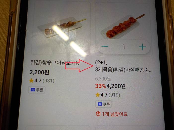 바삭 매콤순살 꼬치가 2+1이네요. 그러니까, 꼬치 3개에 4200원이라는 설명... 원래 하나에 2100원짜리인데, 2+1 가격으로 판매 중이었습니다. 구입하지 않을 수 없겠죠.
