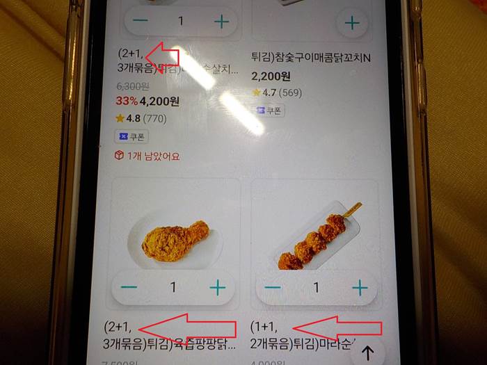 이외에도 2+1 종류의 상품들이 많았습니다. 특히나, 마라 순살은 1+1이더라는... 그렇게 2+1 할인 행사 중인 닭다리 튀김을 포함해서 총 11개의 상품을 구입하기로 했습니다. 그러니까, 닭다리 튀김 3개 그리고 순살 꼬치 8개(2+1 두 가지, 1+1 한 가지)를 장바구니에 담았습니다.