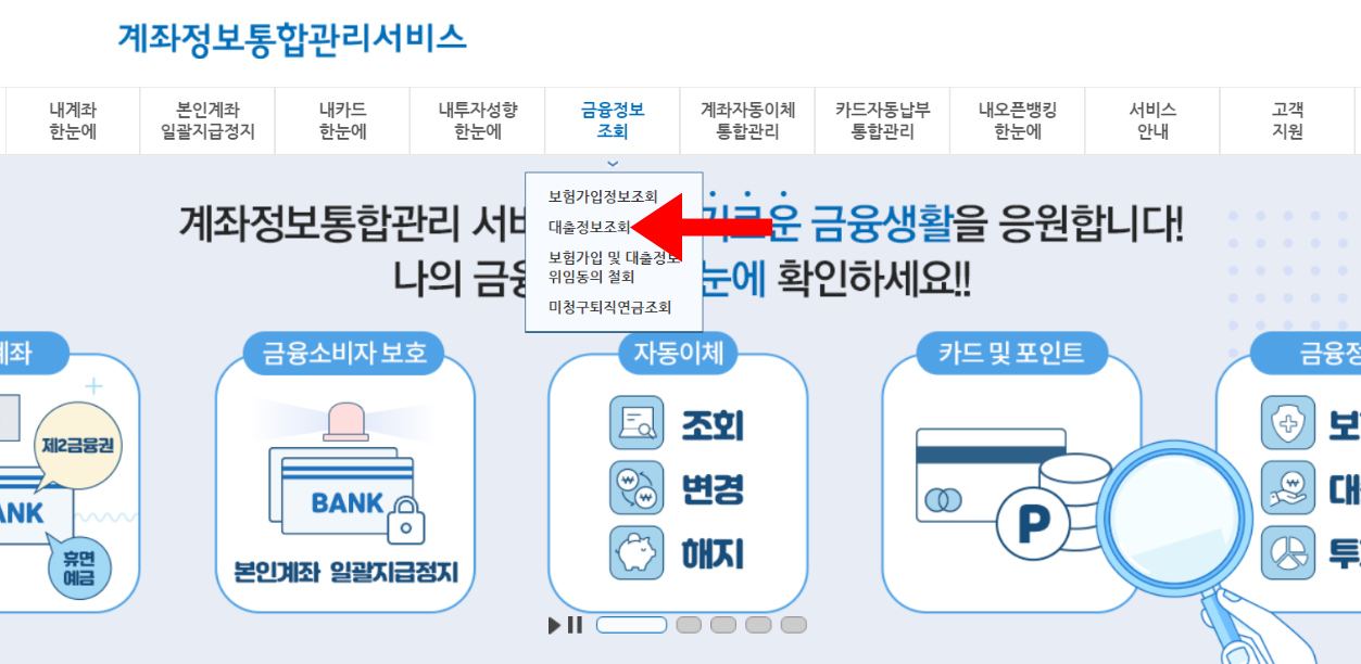 오늘 소개해드릴 정보 본인명의 대출 조회 확인은 첫 화면에 있는 위쪽 메뉴 '금융정보조회'에서 찾아볼 수 있습니다. '금융정보조회' 메뉴에 부속된 메뉴 중에서 '대출정보조회'라는 항목이 있는데, 거기로 들어가면 됩니다. 아래 사진에 있는 빨간색 화살표를 참고하시면 되겠습니다.