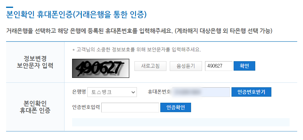 화면캡처 기능을 마비(?)시킨 금융인증서를 통한 본인 인증이 끝나면, 휴대폰 인증을 통한 본인 인증 단계가 한 번 더 기다리고 있습니다. 그러니까, 본인 인증을 두 번 한다는 의미...