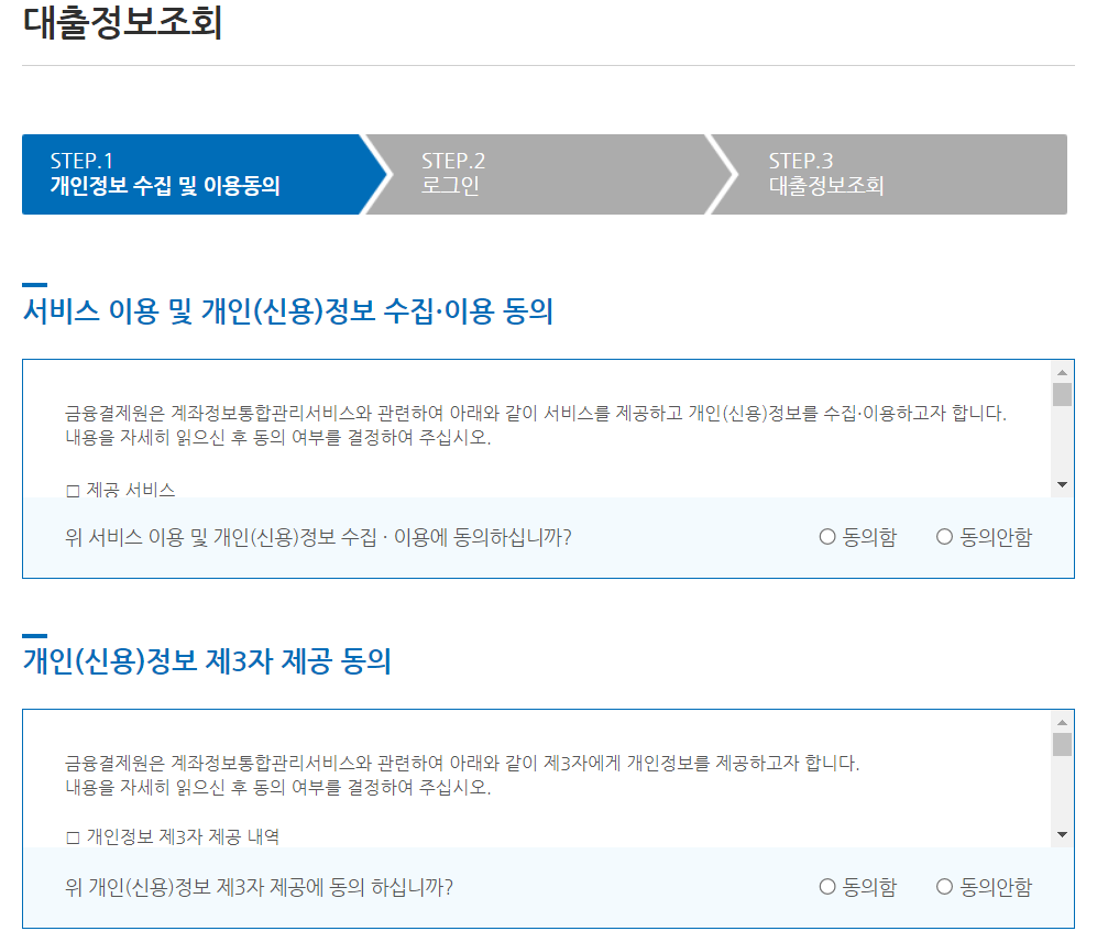 본인명의 대출 학인은 '계좌정보통합관리서비스'라는 사이트를 통해서 가능합니다. 아래 사진이 거기에 접속한 화면으로, 포털사이트에 사이트명 그대로 입력을 하면 바로 확인이 가능하니 찾기 어렵지 않습니다. 참고로, 이 사이트는 금융결제원에서 운영하는 금융 관련 사이트로 믿을 수 있는 곳입니다.
