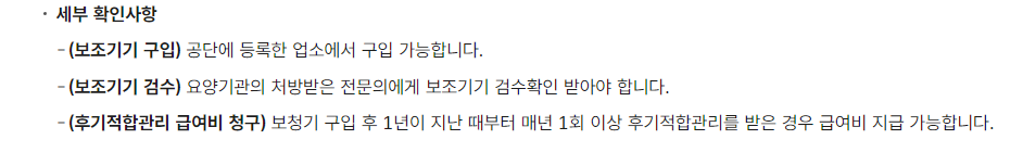 공단에 등록한 보청기 판매업소에서 구입한 보청기만 보조금 지급이 가능하고, 요양기관의 처방을 받은 전문의에게 보청기의 검수확인을 받아야 하며, 보청기 구입 후 1년이 지난 때부터 매년 1회 이상 적합관리를 받은 경우에만 보조금 지급이 가능하다고 합니다.