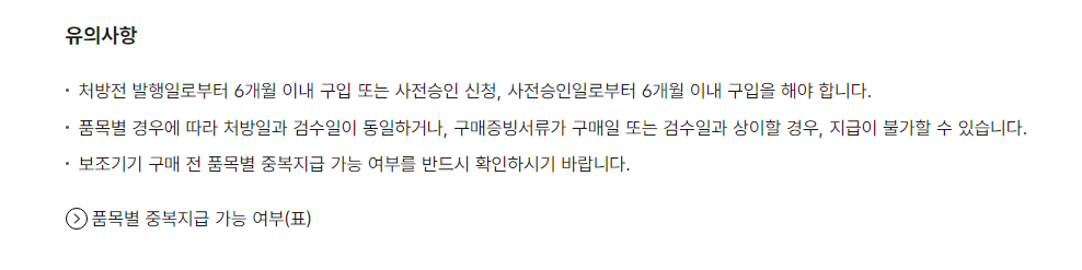 유의사항은 아래와 같습니다. 처방전 발행일로부터 6개월 이내에 구입 또는 사전승인 신청을 해야 한다는 항목이 눈에 들어오네요. 꼭 자세히 읽어보고 필히 참고하시길 바랍니다.