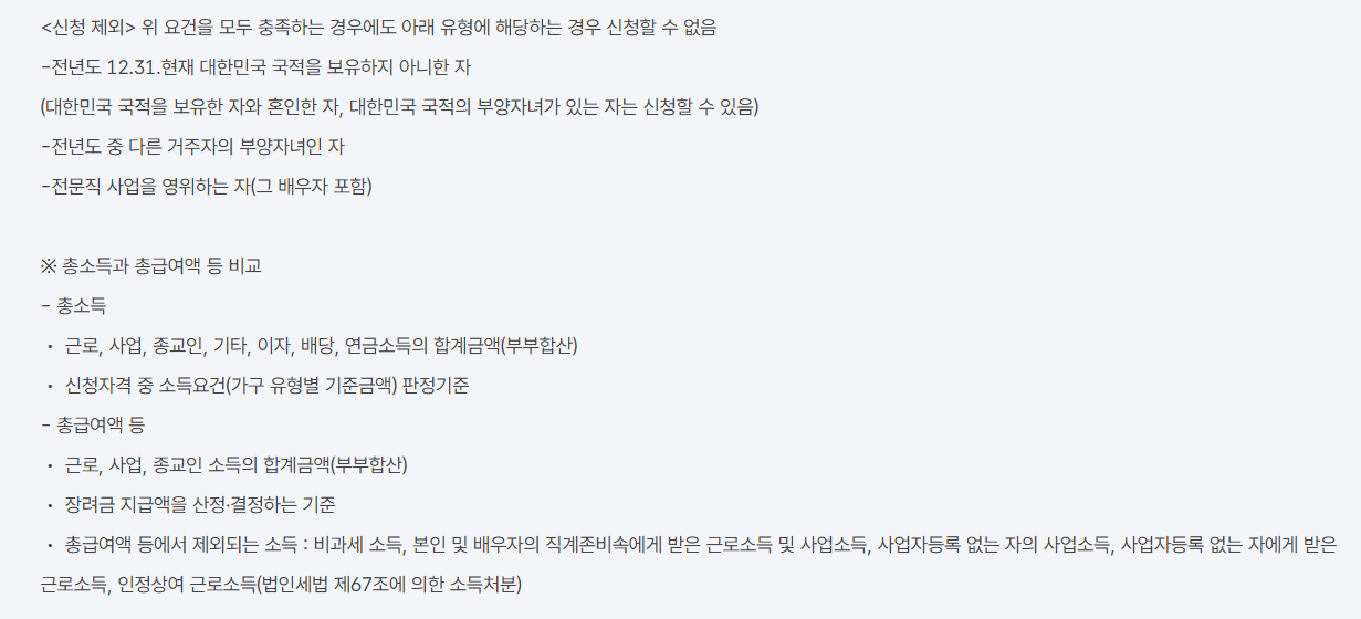 어쨌건, 가장 앞쪽에 있는 '근로/자녀장려금' 항목을 살펴봤습니다. 그러면 아래와 같이 선정기준에 대한 조건이 자세하게 나오니, 본인의 상황에 맞는 것인지 꼼꼼히 따져보고 받을 수 있는 보조금이라 판단이 되면 신청하시면 되겠습니다.