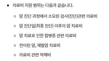 암환자 의료비 지원 혜택 내용은 아래와 같습니다. 암 진단과정에서 발생한 검사비는 물론, 진단 이후의 암 치료비, 합병증 관련 의료비, 전이된 암 재발암 치료비, 약제비까지 모두 포함이 된다고 하네요.