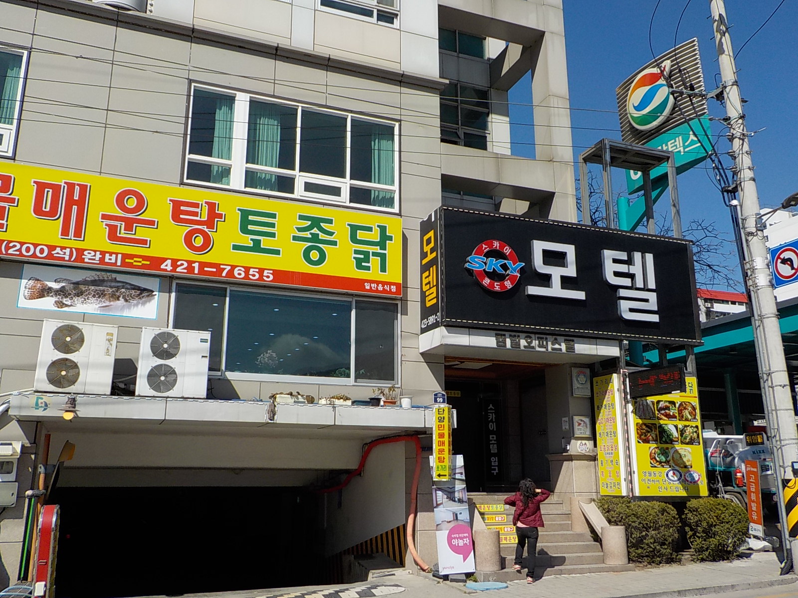 단양 모텔 스카이에 도착했습니다. 입구 바로 옆 지하에 10여 대 정도 주차할 수 있는 주차장이 있었구요, 바로 앞이 무료 공영주차장이어서 거기에 주차를 해도 됩니다.