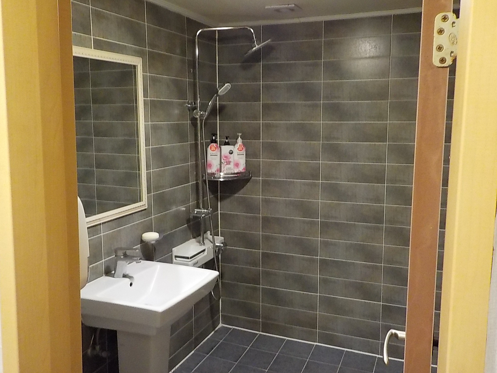 저희가 묵었던 객실입니다. 문을 열고 들어가면 왼쪽이 욕실문, 오른쪽이 방문... 중문이 있어서 좋은 점은 있지만, 욕실이 바깥에 있어서 불편한 점도 있습니다. 옛날 모텔 구조...