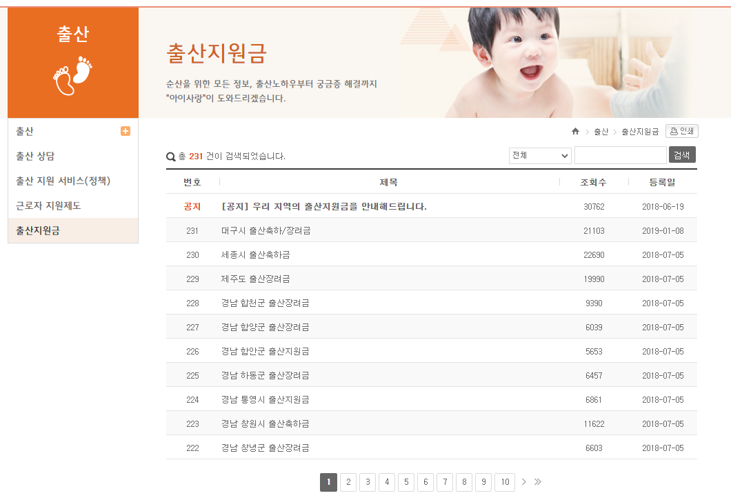 출산지원금에 들어가보면 아래와 같은 화면으로 바뀝니다. 대구시 출산장려금으로 시작되는 각 지역의 출산 지원금 상세내역을 알 수 있는 일종의 정보게시판...