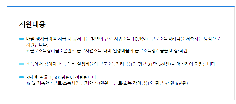 지원내용은 위와 같습니다. 간단히 정리를 해드리자면, 본인이 저금해야하는 금액 10만 원에 정부에서 지원하는 금액 31만 6천 원을 합해서 매월 41만 6천 원을 저금해주는 정책이라는 의미입니다. 그렇게 41만 6천 원을 매월 저금하여 3년 후에 약 1500만 원의 목돈을 마련하게 하는데요, 본인이 10만 원을 내면 나라에서 31만 원 이상을 지원해주니 지원대상 분들 중에서 이 청년희망키움통장을 만들지 않는 사람은 손해라는 표현이 모자랄 만큼 혜택이 큰 정책입니다. 여하튼, 생계급여에서 본인이 일을 하여 생기는 공제액 10만 원만 있으면 더불어 30여만 원이 더 붙는 그런 놀랄만한 혜택이니 해당자분들은 놓쳐서는 안 될 국가지원정책입니다.