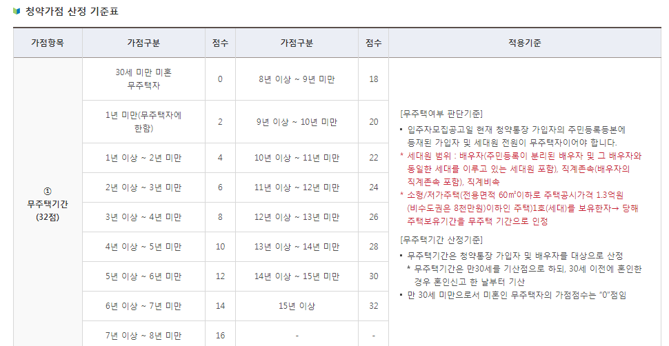 표에 설명하고 있듯이 무주택기간은 만점이 32점입니다. 1년 미만의 무주택자가 2점, 거기서부터 1년 단위로 2점씩 플러스가 됩니다. 그리고, 무주택기간이 15년 이상이 되면 만점인 32점을 받습니다. 여기서 주의해야 할 사항도 있는데요, 꼼꼼히 살펴봐야만 합니다. 가령 예를 들어서 청약을 하는 본인이 무주택기간이 15년 이상이어도, 배우자가 주택을 소유한 이력이 있으면 청약점수는 받을 수가 없습니다. 그러니까, 본인과 배우자 모두의 무주택기간이어야 한다는 설명... 소형 저가주택에 관한 유의점이나 30세라는 나이에 관한 기준 등도 미리 체크해야 할 부분이니, 꼼꼼히 살펴보시고 참고하시길 바라겠습니다.