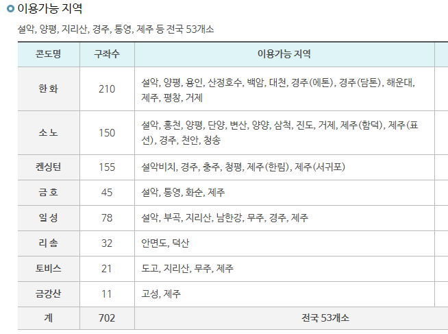 한화, 소노, 켄싱턴 등 이름만 들어도 알만한 콘도, 전국 53개의 콘도의 702개 구좌를 이용할 수 있습니다. 본인이 원하는 지역의 본인이 원하는 콘도를 선택해서 예약하면 되니 어려울 것도 없습니다. 다만 말씀드린 대로, 내가 원하는 날에 경쟁률이 높으면 예약이 불가능할 수도 있으니, 이 부분은 감안을 하셔야 하겠습니다.