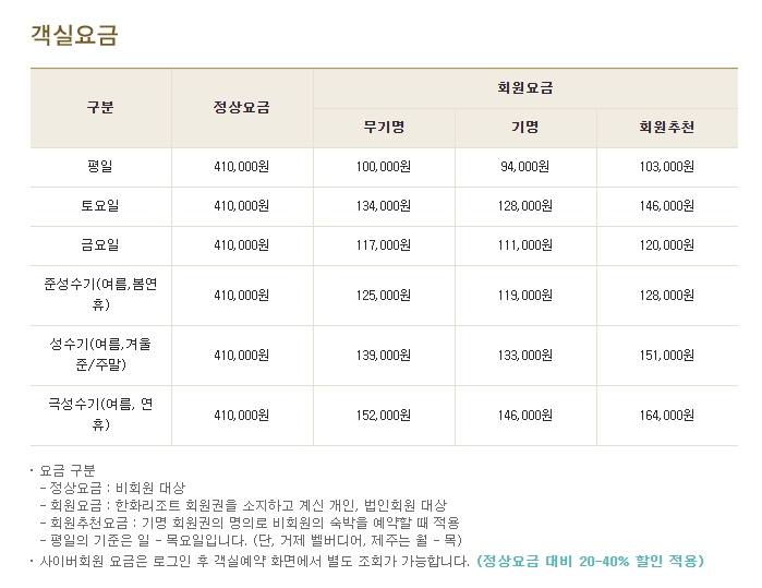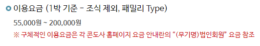 55000원에서 200000원이라고 되어 있습니다. 구체적인 이용요금은 각 콘도의 홈페이지를 참고하시면 되겠는데, 홈페이지 요금란에 (무기명) 법인회원의 가격이니 이 부분만 알고 계시면 되겠습니다.