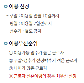 신청대상은 모든 근로자가 가능하구요, 이용도 모든 날짜에 가능하다고 보시면 됩니다. 물론, 같은 날 이용하려는 사람이 많을 시에는 조건에 따라 우선순위를 정해서 떨어질 경우도 있습니다만...