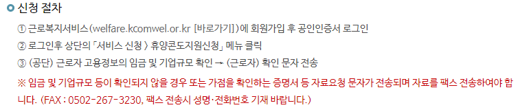 신청절차는 아래와 같습니다. 근로복지공단 근로복지서비스에 가입을 해서 공인인증서 로그인을 한 다음에, 휴양콘도지원신청 메뉴를 통해 예약이 이루어집니다. 보다 자세한 사항은 근로복지공단 근로복지넷을 참고하시면 되겠습니다.