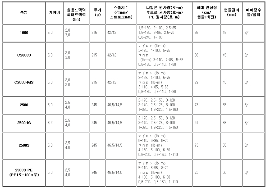아래는 시마노 세도나 스피닝 릴의 종류와 사양입니다. 제가 이런 쪽으로는 거의 문외한이어서 이 표만 보고 상당히 고민을 많이 했는데요, 결국에 결정한 것이 세도나 2500번입니다. 가격차이도 크게 나지 않고 무게도 5g밖에 차이가 안나는 3000번 릴을 선택하려다가, 거의 10시간씩 낚시를 하려면 조금이라도 가벼운 것이 나을 것 같아서 2500번으로 선택을 했습니다. 그런 의미이면 30g이나 가벼운 2000번대 릴도 나쁜 선택이 아닌 것 같기도 한데, 이건 힘이 왠지 달릴 것 같기도 하고... 어쨌거나, 초보자의 이런저런 고민 끝에 결정한 것이 2500번 스피닝 릴입니다.