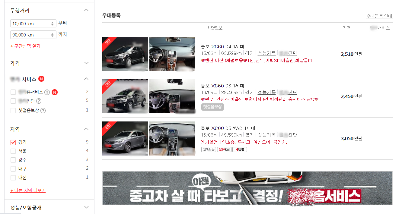 그렇게 검색한 볼보 xc60 2009-2017년식, 주행거리는 10000-90000km 그리고 경기도 지역의 차량, 9대...
