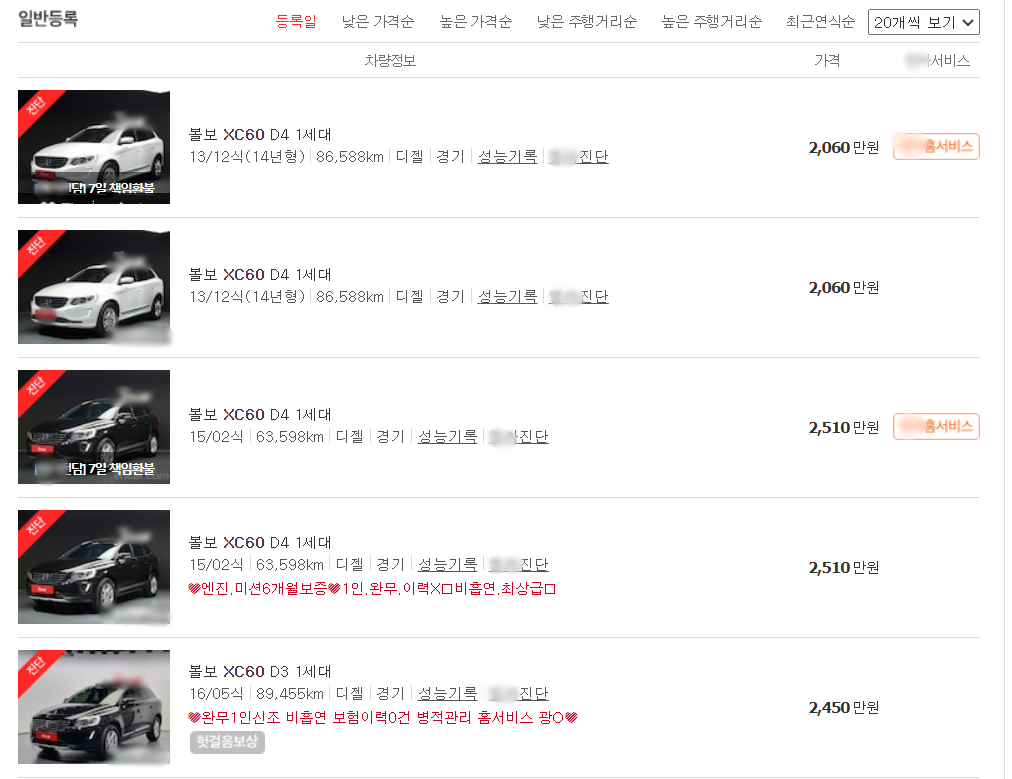 오늘은 볼보 중고차 가격을 한번 알아봤습니다. 얼마전에, 교통사고에 당했을때 안전성이 좋다는 평가를 볼보 자동차가 높게 받는 다는 것을 보고 관심을 가져봤는데, 그래서 중고차 시세는 어떤가 겸사겸사 궁금해서 확인해봤습니다. 물론, 지금 당장 차를 살것은 아니지만 대략적으로 가격대가 어떤지 궁금해져서 재미삼아 두어곳의 중고차 매매사이트를 통해 확인을 해봤네요. 가장 인기있는 종류인 xc60을 예로 들어서 조사해봤는데요, 그다지 부담스러운 가격대는 아닌걸로 보입니다. 볼보 중고차 시세에 대해 궁금했던 분은 참고하시길 바라겠습니다.