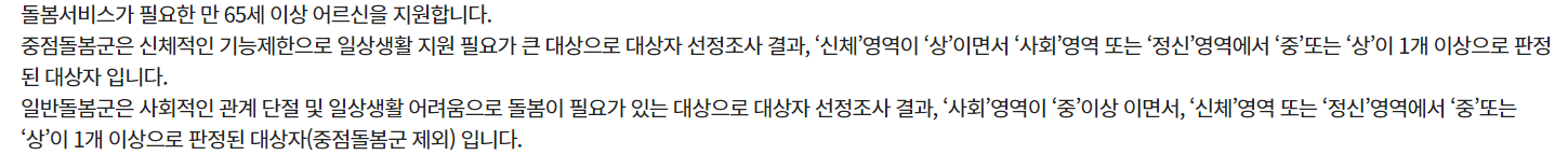 일반돌봄군과 중점돌봄군으로 나누어서 서비스가 지원이 되는데요, 신체영역과 정신영역의 상태를 조사해서 나눈다고 합니다. 기본적으로 만 65세 이상의 노인분이어야만 하고, 독거 조손 고령부부 등 돌봄이 필요한 노인들로, 신체적 기능의 저하 혹은 인지저하나 우울감과 같은 정신적 어려움 등으로 돌봄이 필요한 노인분들에게 지원이 됩니다. 여기에는 고독사 및 자살의 위험이 높은 분들도 해당이 되는데요, 이름 그대로 돌봄이 필요한 65세 이상의 노인분들에게 지원되는 복지제도입니다.