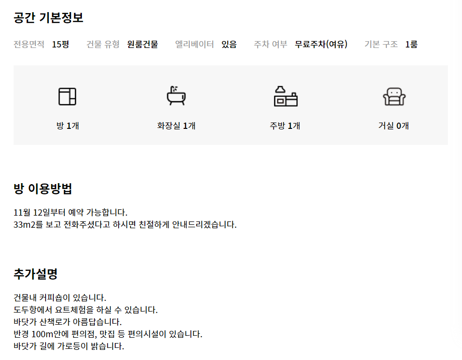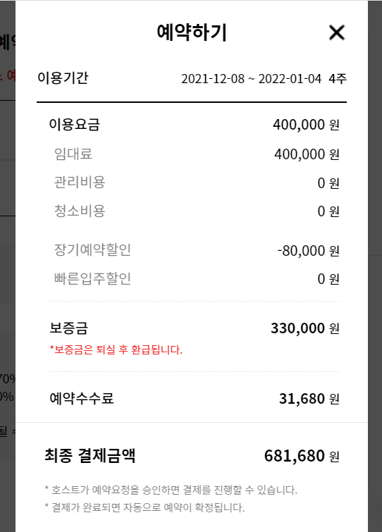 어쨌건 여기도 4주로 기간을 잡고 예약하기를 눌러봤습니다. 이곳은 임대료 외에 관리비와 청소비용이 없어서 굉장히 저렴한 가격입니다. 보증금을 뺀다면 35만 원에 4주간 묵을 수 있는 부산의 숙소이니까요. 사진에는 없습니다만, 상세 설명에 관리비는 없다는 문구가 있는 것으로 봐서는 따로 지불해야 할 비용도 없는 것 같습니다.