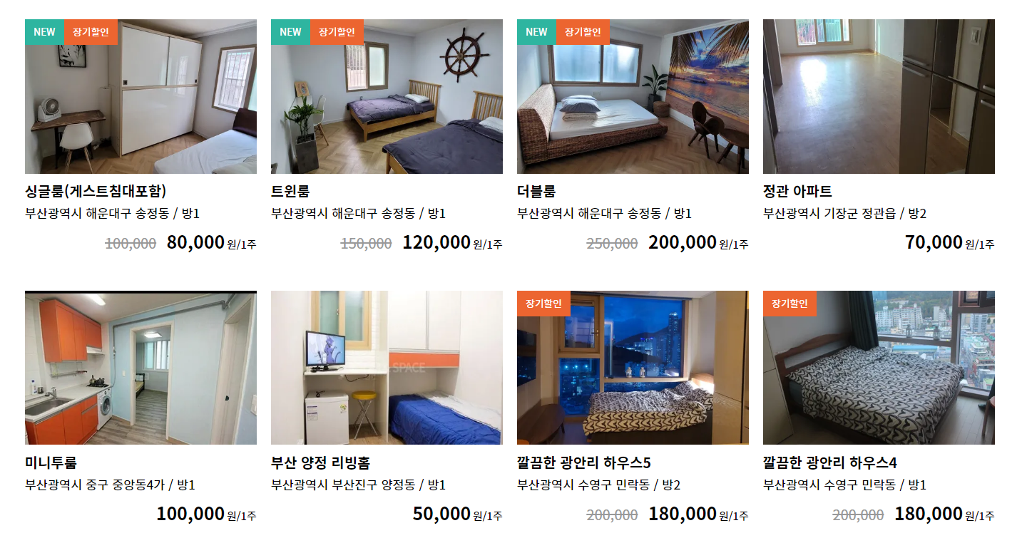그랬더니, 아래의 사진과 같이 총 8개의 숙소가 나왔습니다. 1주일에 7만 원짜리 숙소부터 30만 원이 훌쩍 넘어가는 숙소까지... 여기에 표기된 요금은 오로지 숙박을 위한 금액이고, 예약을 하기 위해서 들어가면 이런저런 비용들이 더 붙습니다.