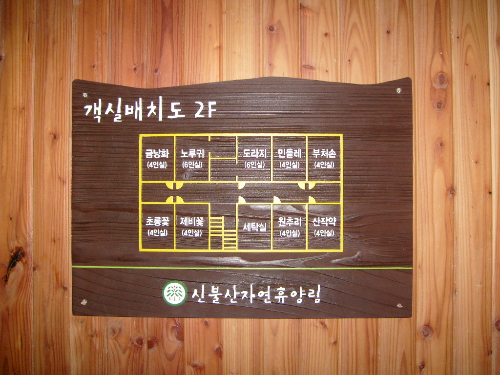 제가 묵었던 신불산 자연휴양림 상단 휴양관의 2층 배치도입니다. 배치도 상으로는 4인실과 6인실만 있지만, 8인실도 있습니다. 8인실은 아마도 1층에 있는 모양인데요, 각각 이용요금도 상이합니다.