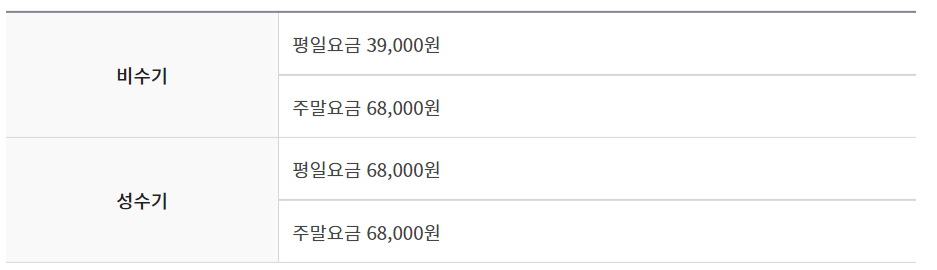비수기 평일 요금은 85000원이구요, 나머지 구간은 모두 144000원입니다. 참고하시길...
