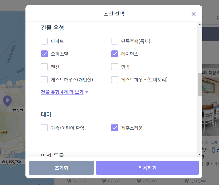 다음은 건물 유형에 대한 조건인데, 이건 오피스텔이나 레지던스로 선택을 했습니다. 저 같은 경우에는 두 번 모두 오피스텔에서 한달살기를 했는데요, 편했던 기억이 있네요. 기본적으로 필요한 옵션은 모두 갖추어져 있고, 청결도도 괜찮은 편이어서... 아래에 있는 테마 조건은 제주스러움으로 선택을 했는데, 굳이 선택하지 않으셔도 되겠습니다.