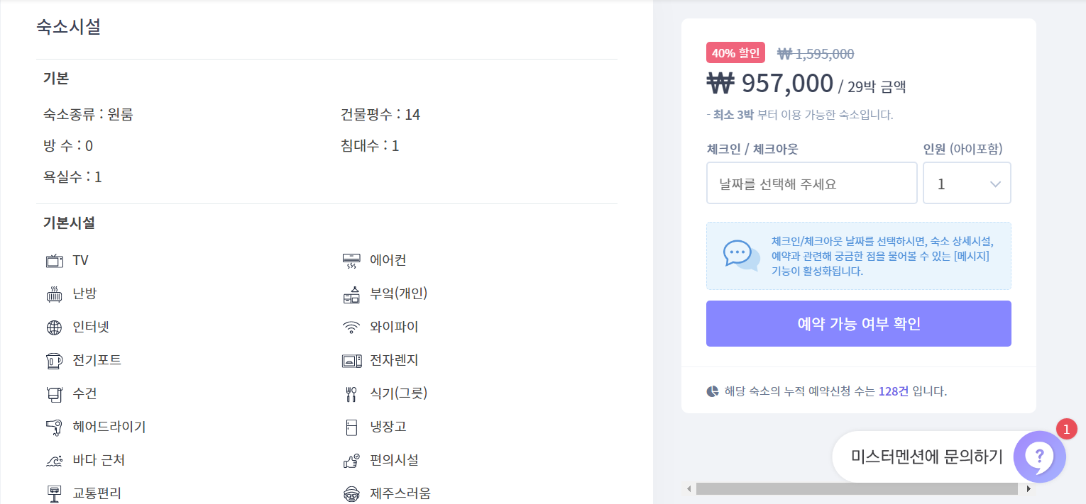 29박 금액, 그러니까 한달살기 금액이 957000원입니다.