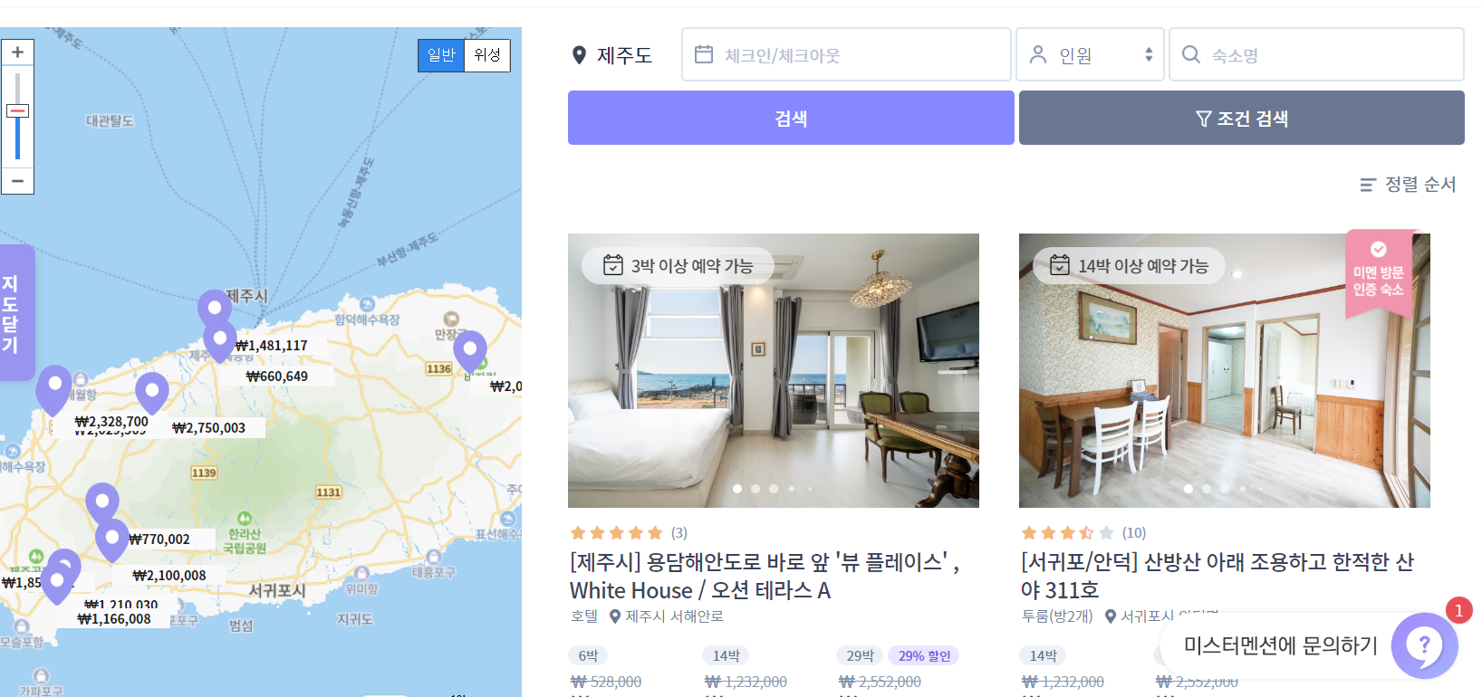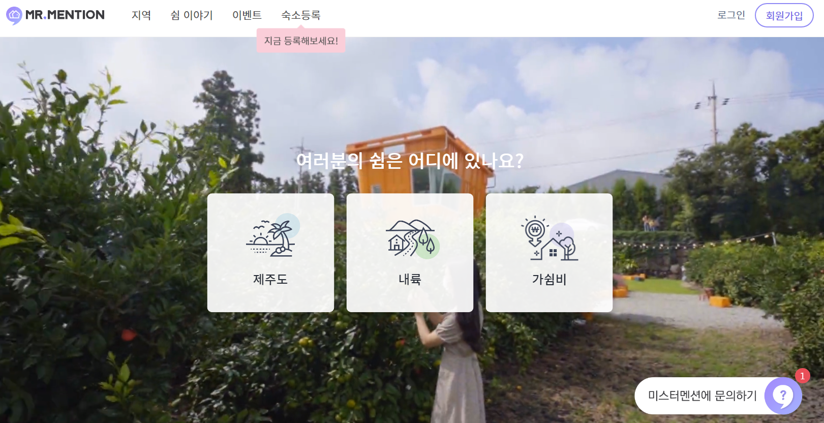 아래가 미스터멘션에 접속한 화면입니다. 화면 정중앙에 제주도, 내륙, 가쉼비라는 항목이 보이는데, 오늘은 제주 한달살기 숙소에 대한 소개여서, 그리고 개인적으로는 제주 한달살기만 이곳을 통해 경험해본 것이어서 제주에 대한 설명만 드릴까 합니다. 다른 항목도 검색하는 방법은 비슷하니 참고하시길 바라겠습니다.