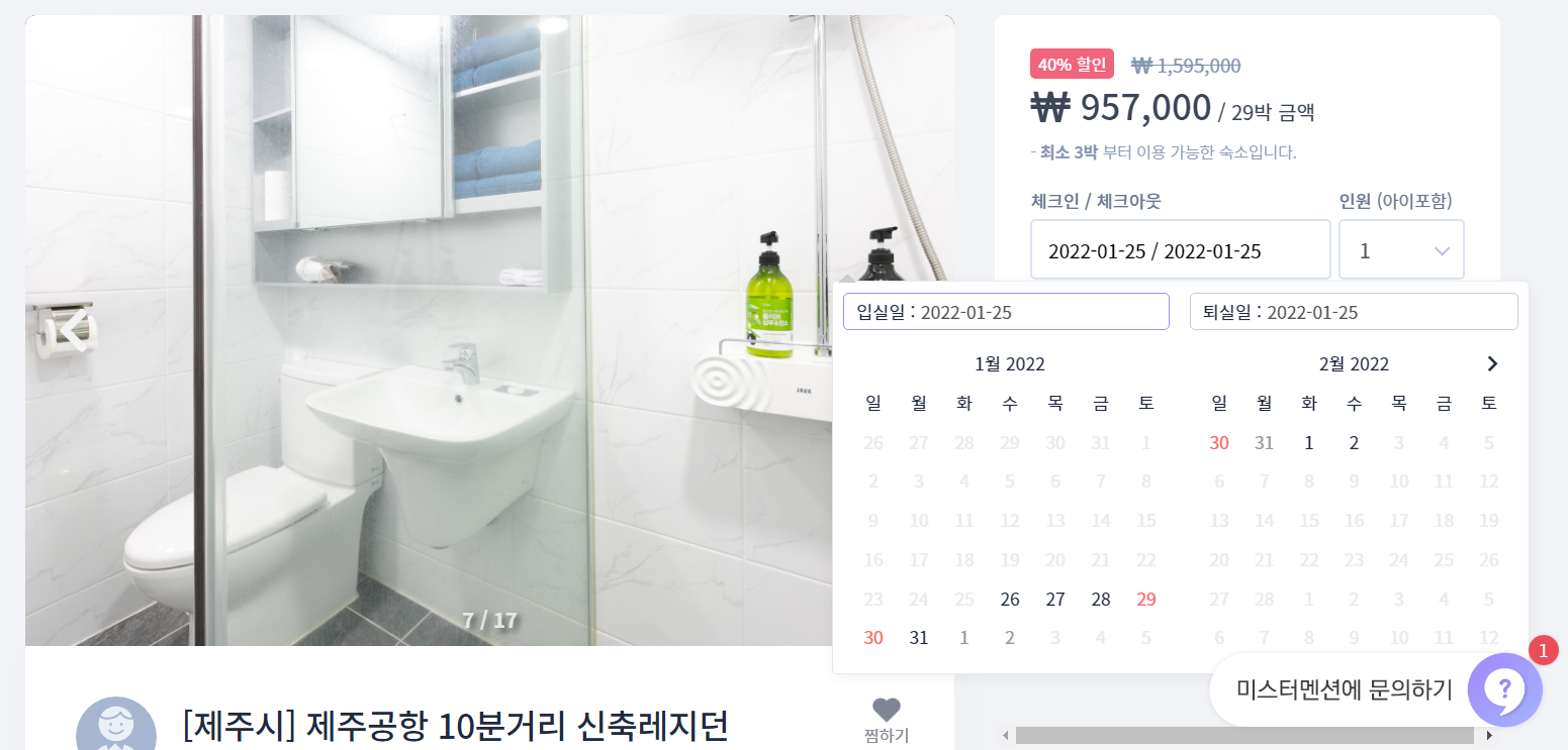 체크인, 체크아웃이 가능한 날짜를 살펴봤습니다. 예상은 했었지만, 꽤나 인기 있는 숙소로 보입니다. 달력에 진하게 표시되어 있는 날짜는 예약이 가능한 날들이고, 희미하게 처리되어 있는 날들은 예약이 불가한 그러니까 이미 예약이 된 날이라는 설명입니다. 어찌 보면 체크인, 체크아웃 날짜부터 체크하는 게 가장 효율적일 수도 있겠습니다. 실컷 고민해서 선택을 했는데, 내가 원하는 날짜에 예약을 할 수 없다면 시간낭비일 테니까...