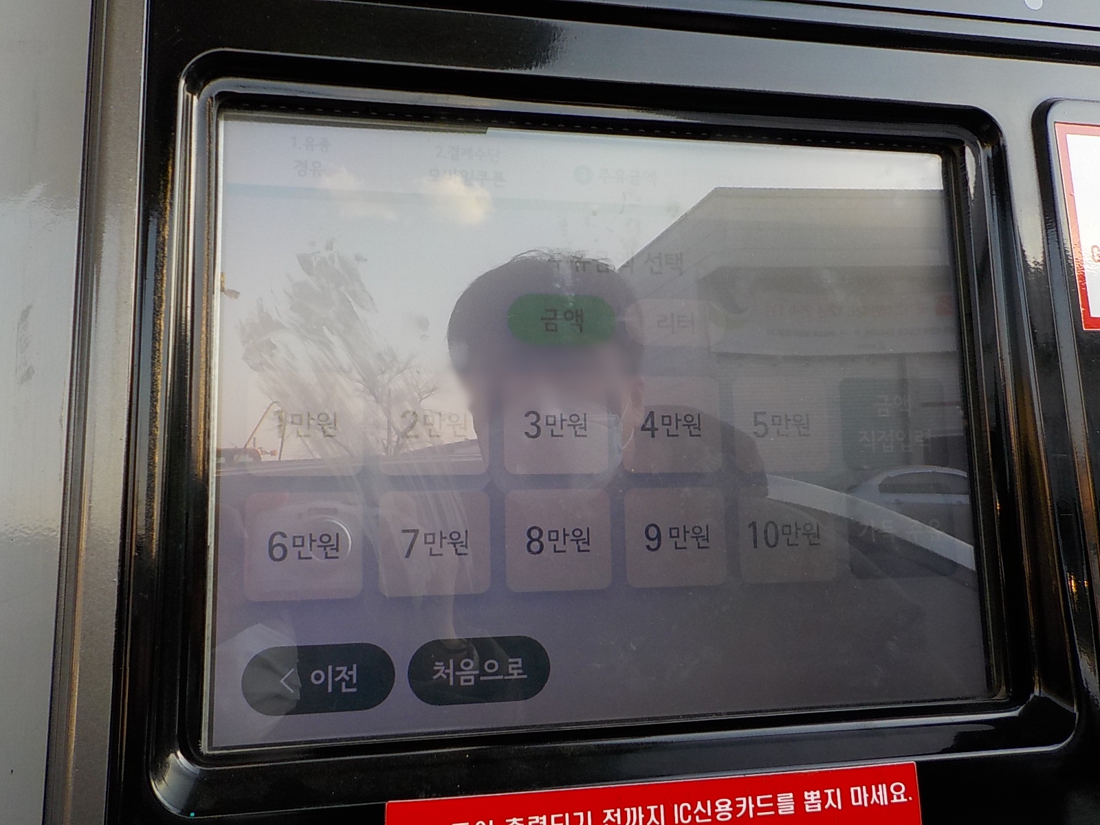 결제방법을 선택합니다. 지금까지 주유소에서 주유 후 결제는 신용카드로만 해서 잘 몰랐는데, 결제방법에 '모바일 쿠폰'이라는 것이 있습니다. 그러니까 선물로 받은 것이거나 저렴한 가격에 구입을 한 것이거나 모바일 주유권은 여기를 선택해서 들어가셔야만 합니다. 사진이 흐릿해서 잘 보이진 않은데 모바일 쿠폰 아래쪽에 쿠폰+신용카드라고 되어 있습니다. 그러니까, 본인이 가진 모바일 쿠폰 이상의 금액은 신용카드로도 결제가 가능하다는 의미입니다.