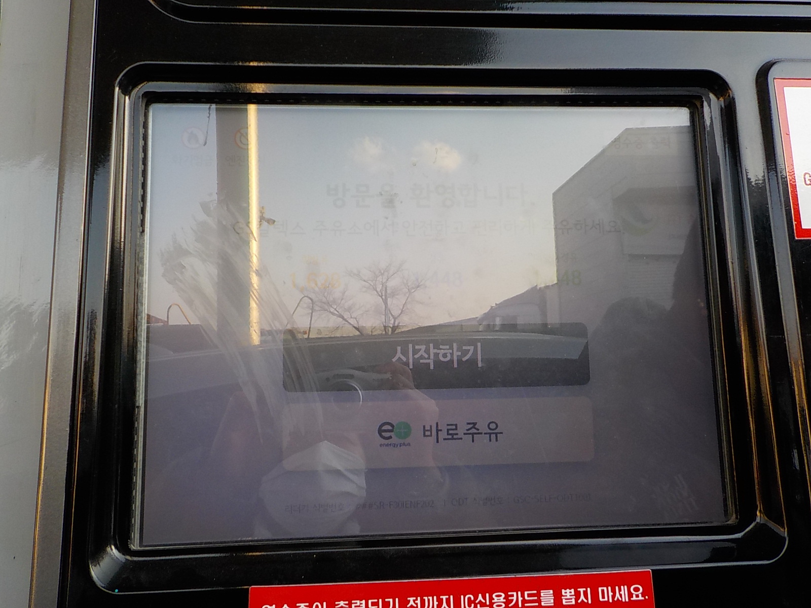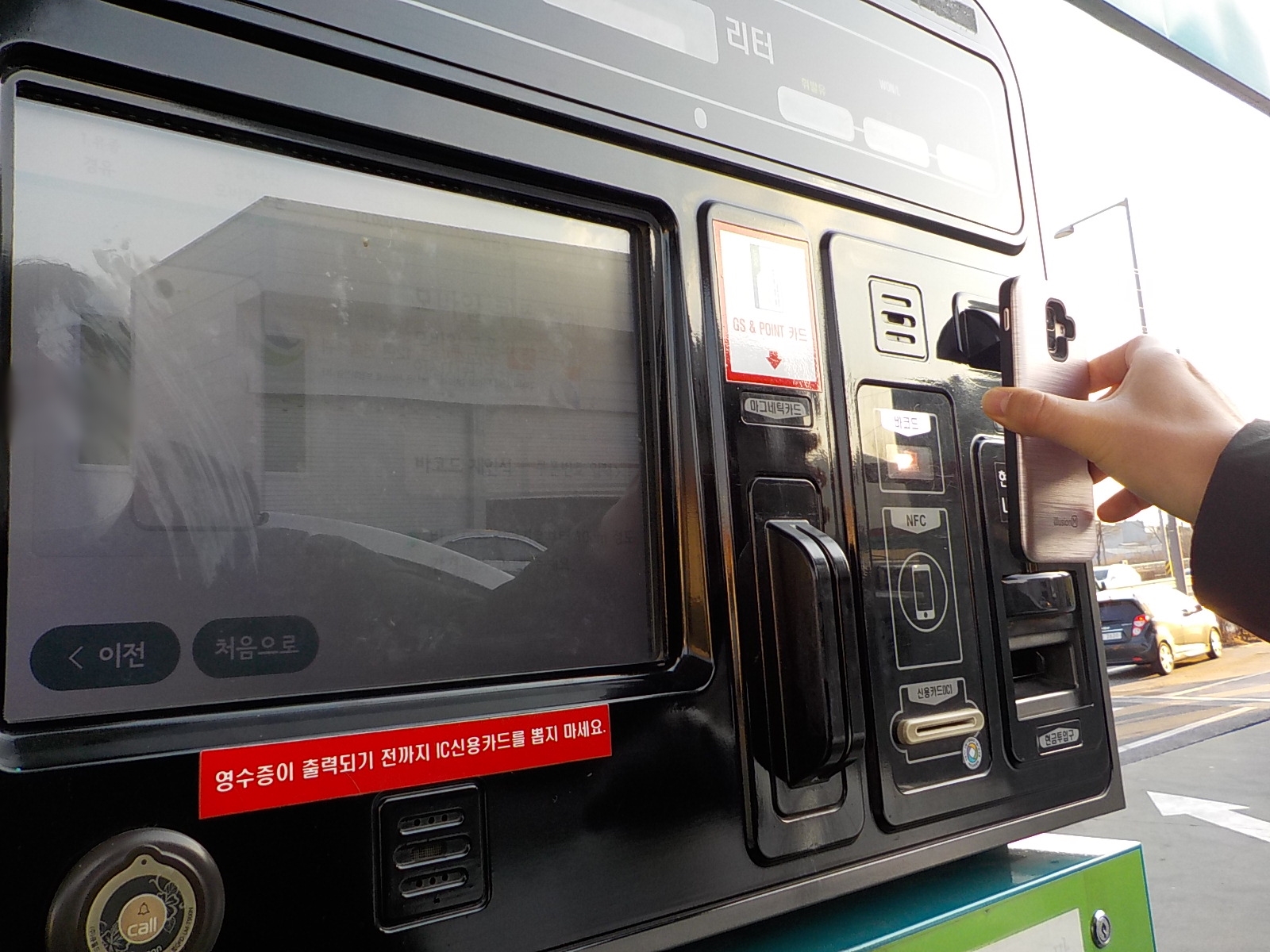 그런 다음에 아래의 사진처럼 바코드 부분을 주유기에 있는 바코드 센서에 갖다 대기만 하면 됩니다. 약 10센티 정도 띄운 후 갖다 대면되는데요, 역시 어려울 것이 없는 방법입니다. 처음 한 번만에 안되더라도 천천히 살짝 거리를 조절하면서 움직여보면 되니 당황하실 필요 없겠습니다. 주유기 메인 화면을 보면서 움직이면 누구라도 쉽게 할 수 있는 과정...