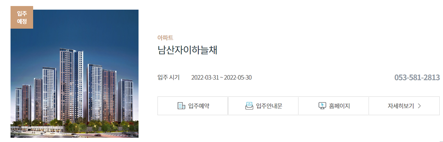 남산 자이 하늘채 홈페이지를 확인해봤습니다. 3월 31일부터 5월 30일 사이 입주 예정입니다.