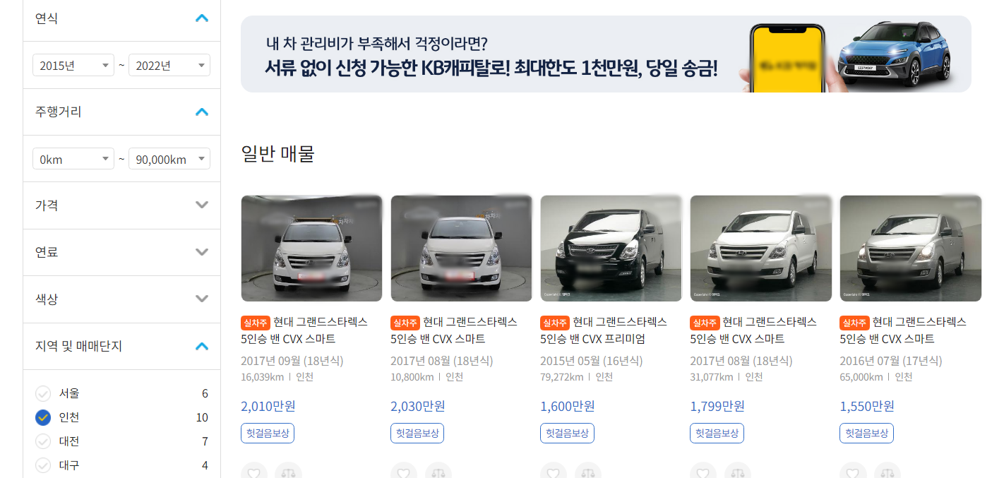 850대도 적은 숫자가 아닌지라 보다 더 디테일하게 조건을 더해서 추려봤습니다. 연식을 2015년에서 2022년 사이, 주행거리를 90000KM 이하, 그리고 인천지역... 어찌 보면 지역 조건이 숫자를 줄이는데 가장 효과적인 조건이겠는데, 그렇게 조건을 바꾸어서 검색을 하니, 총 8대로 간추려졌습니다.