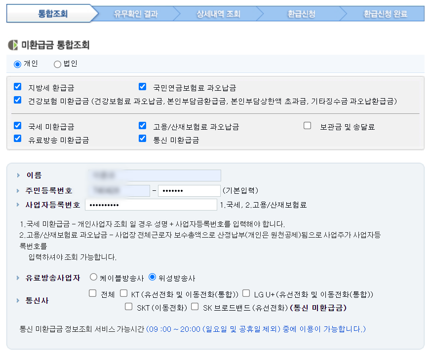 사진에 보면 아시겠지만, 조건으로 개인과 법인으로 나뉘어져있고, 칸막이를 두어 위쪽과 아래쪽으로 나뉘어져 있습니다. 대부분의 사람들은 법인으로 검색해볼 이유는 없을 것 같고, 칸막이로 나뉘어져 있는 것은 사업자등록이 된 사람들에 한해 발생할 수 있는 미환급금의 유형때문으로 여겨집니다. 어쨌건, 검색조건을 개인으로 해서 윗부분만 체크를 하고, 필요한 정보인 성명과 주민번호를 입력했습니다.