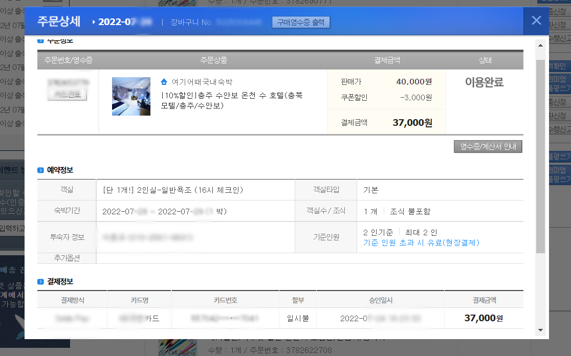 제가 이번 수안보 수호텔에 숙박하면서 예약했던 내역... 말씀드린 대로, 평일 하룻밤 숙박을 37000원에 했습니다. 숙박 예약 사이트마다 차이는 있겠지만, 대략 비슷한 수준이라고 보시면 됩니다. 여기저기 살펴보고 조금이라도 본인에게 더 저렴한 곳에 예약을 하시면 되겠네요.