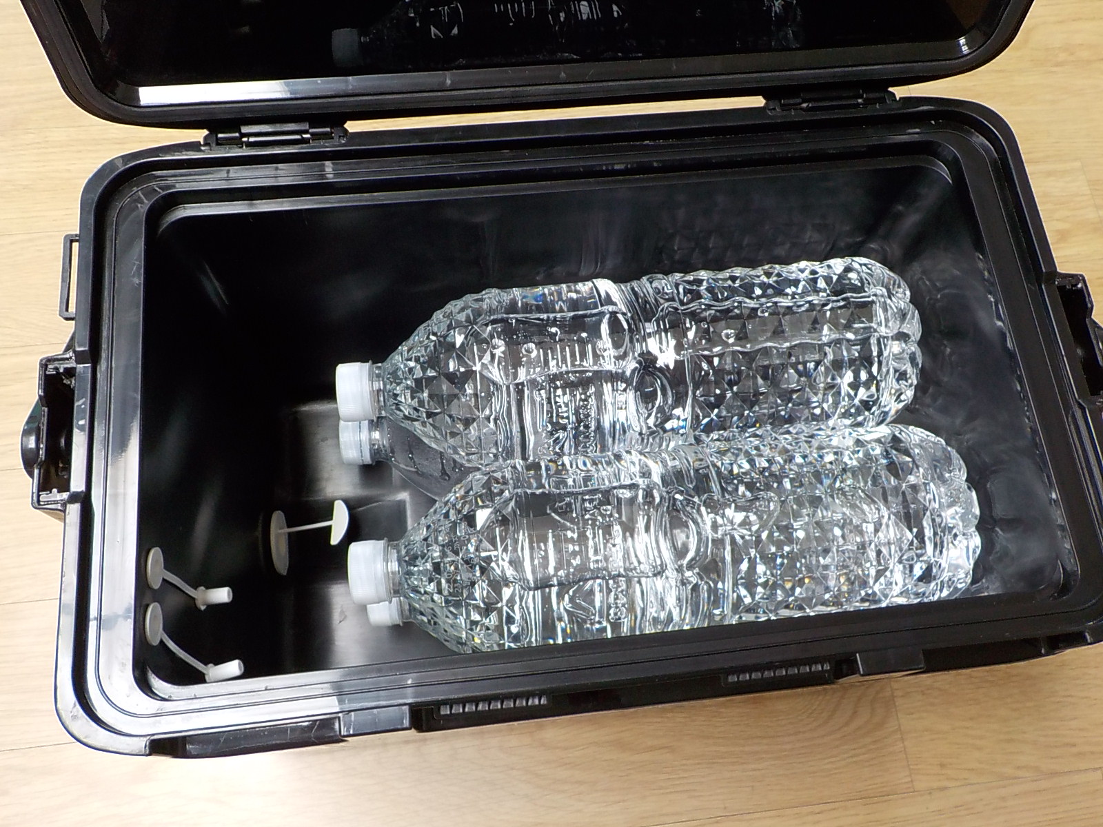 대신 뉘어서 넣으면 아래와 같이 4개의 생수병은 넉넉하게 들어갑니다. 그 위에 500ML짜리 생수병도 다수 넣을 수 있을 만큼... 아마도, 2L 생수병 2개를 얼려서 넣을 확률이 가장 크다고 보는데요, 그러면 쭈꾸미나 갑오징어 혹은 문어 같은 두족류는 걱정 없이 담아올 수 있을만한 크기로 보입니다. 전설의 낚시꾼이 아니라면...