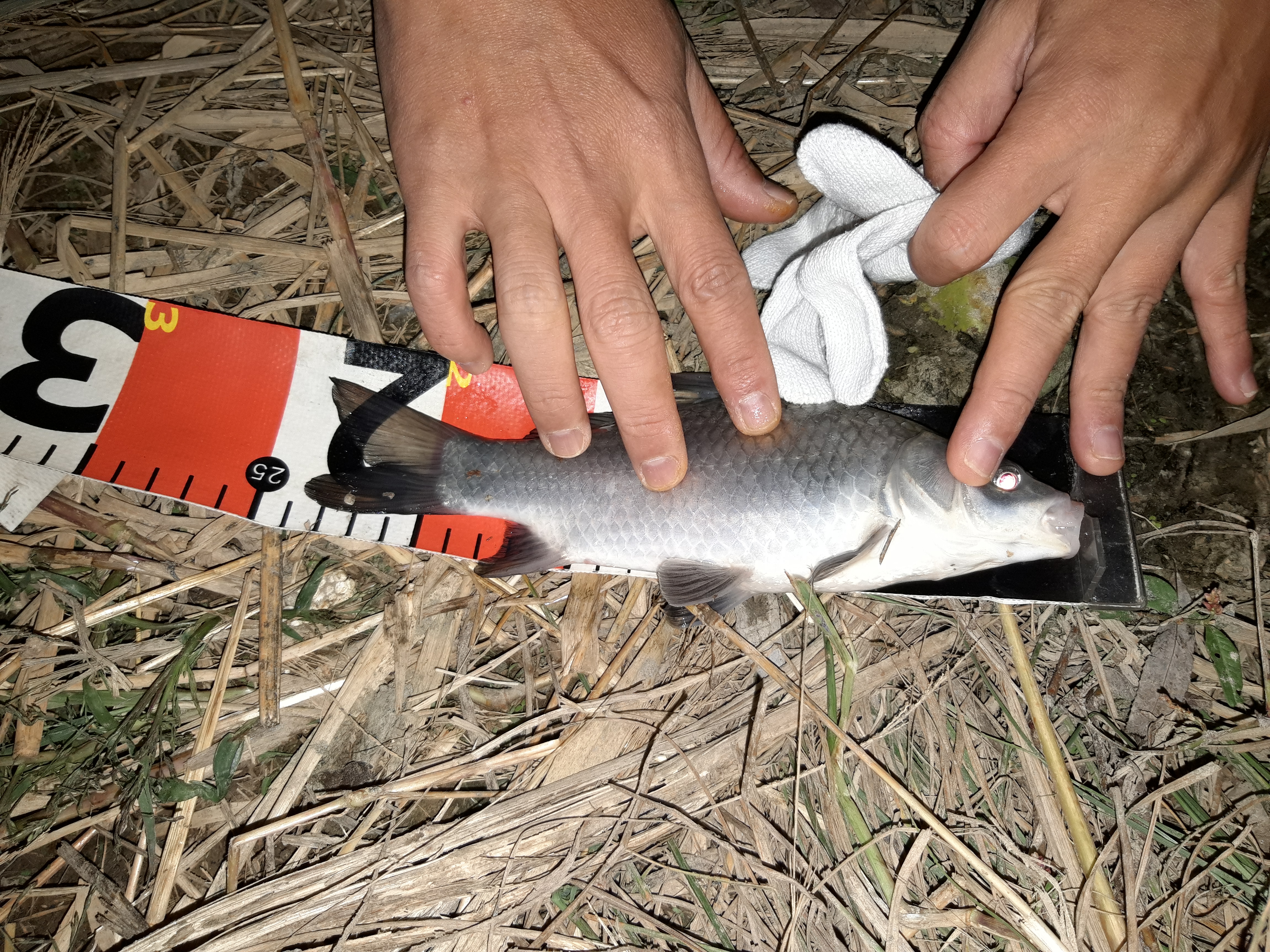 오래 지나지 않아 잉어 새끼 한 마리가 물어줍니다. 옥수수 글루텐을 달고 던져 넣은 낚시대에서 다른 낚싯대를 채비하는 도중 과감하게 물고 가는 입질... 조금 늦게 발견했으면, 낚싯줄이 여럿 엉킬뻔했습니다.