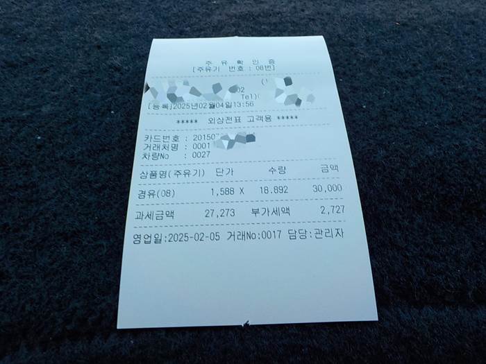 그 영수증... 특이하게도 외상으로 결제가 된 상태입니다. 처음 가 본 주유소입니다만, 외상 결제로 되어있네요. 어쨌건, 3만 원치 공짜 주유는 했으니 상관은 없겠습니다.